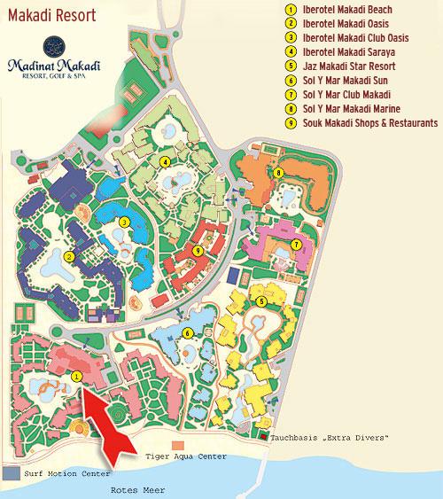 Madinat Makadi kūrorta centrā. Jūras krastā, pie smilšu pludmales, lieliskajā Makadi Beijas līcī, apmēram 35 km līdz Hurgadas centram – Sakkala (trīs reizes dienā par papildus samaksu kursē autobuss), 30 m līdz Hurgadas lidostai.