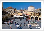 Rodos pastāv jau vairāk nekā 2400 gadu. Vienas ekskursijas laikā iespējams apmeklēt gan antīko pilsētas daļu — Afrodītes un Zeva tempļa paliekas un amfiteātri, gan lieliski saglabājušos viduslaika pilsētu, kuru ieskauj 4 km gari, divi paralēli pilsētas aizsargvaļņi, starp kuriem iekārtots gājēju ceļš, bet vietām izveidoti krāšņi dārzi. Interesants apskates objekts ir Lielmestru pils, kur muzejā skatāmas no Kosas salas pārvestās romiešu mozaīkas. Senajā hospitālī darbojas arheoloģijas muzejs. Jaunā pilsētas daļa ar teātri, municipalitātes ēku, slēgto tirgu, krodziņiem un veikaliem veidojusies XIX gs. beigās — XX gs. sākumā. Visburvīgākā pilsētas iezīme ir no sīkiem jūras olīšiem dažādos mozaīku rakstos izliktais bruģis.